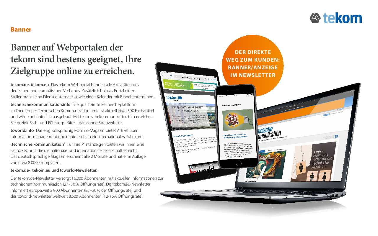 Möchten Sie Ihr Unternehmen in unserer Fachzeitschrift ’technische kommunikation’, auf tekom.de oder tekom.eu präsentieren und von unserer großen Reichweite profitieren?